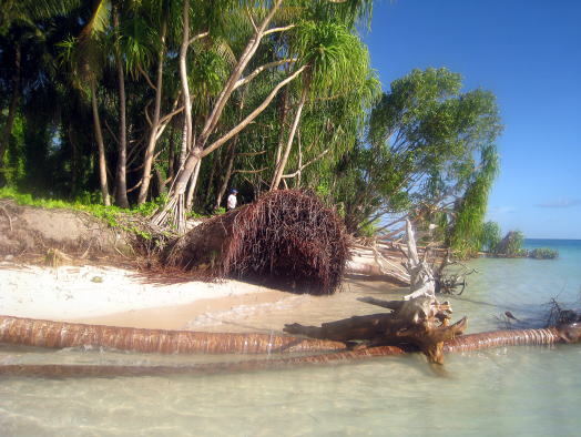 写真の巨大な根っこを見てもわかるように、椰子の木が土壌をつなぎとめている。これらの椰子が倒れることにより、新たな土壌の流出が予測できる。